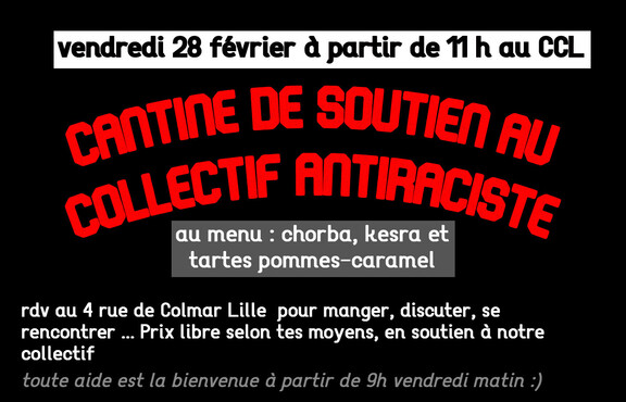 Centre Culturel Libertaire (CCL) 4 rue de Colmar à Lille Metro Porte des Postes, prendre Rue des postes puis 2ème rue à droite à l'Eglise. le CCL est à coté de l’école Viala.