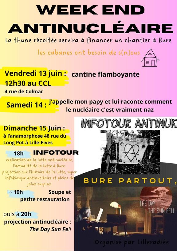 💥ANTINUK: Ce vendredi 13 (🐈⬛) rdv à 12h30 au CCL pour une cantine en soutien à Lilleradiée. Les thunes serviront à financer un chantier en août à Bure, sur le terrain de la Gare, qui sera bientôt expulsable.