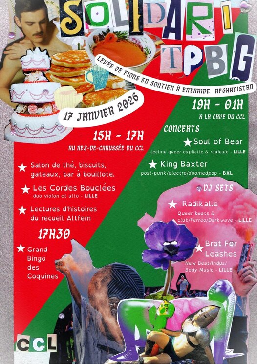 ✨La Théière et RESIST t'invitent le samedi 17 janvier de 15h à 01h au CCL à la soirée de soutien pour le collectif Entraide Afghanistan. Ce collectif répond à des demandes de personnes queers afghanes. L'enjeu de cette soirée est de récolter assez d argent pour que le collectif puisse apporter l aide financière nécessaire et rapidement