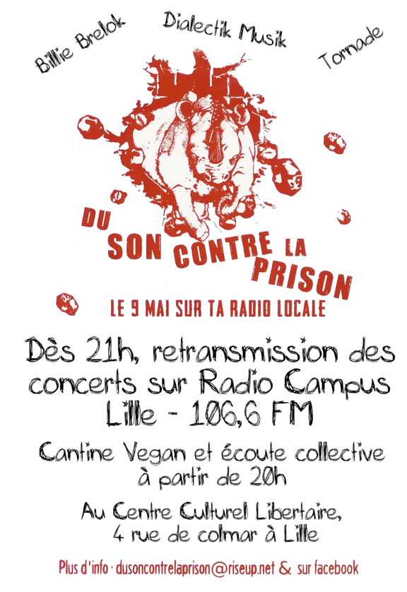 21h à 00h : Retransmission et écoute collective des concerts (Tornade, Dialectik Musik, Billie Brelok) Du Son Contre La Prison, et suite de la cantine !