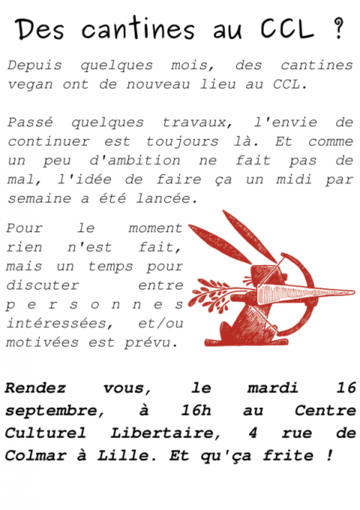 Pour le moment rien n'est fait, mais un temps pour discuter entre personnes intéressées, et/ou motivées est prévu. Rendez vous, le mardi 16 septembre, à 16h au Centre Culturel Libertaire, 4 rue de Colmar à Lille.