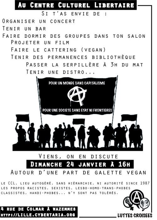 Centre Culturel Libertaire (CCL) 4 rue de Colmar à Lille Metro Porte des Postes, prendre Rue des postes puis 2ème rue à droite à l'Eglise. le CCL est à coté de l’école Viala.