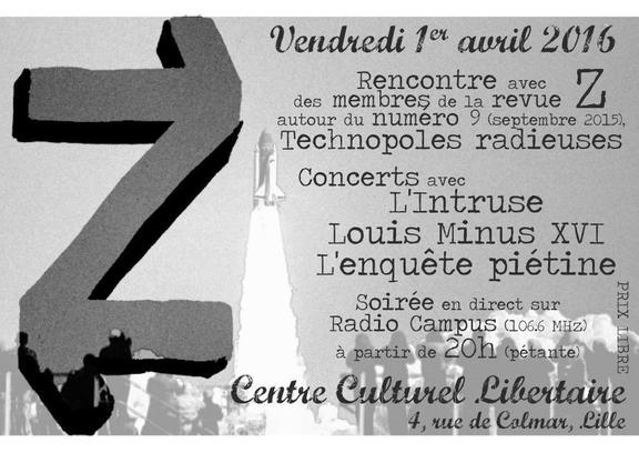 À 20h (pétante !) au CCL et en direct de Radio Campus Lille (106.6 MHz), discussion avec des membres de la revue Z autour du dernier numéro paru à l'automne 2015 intitulé Technopoles radieuses.
