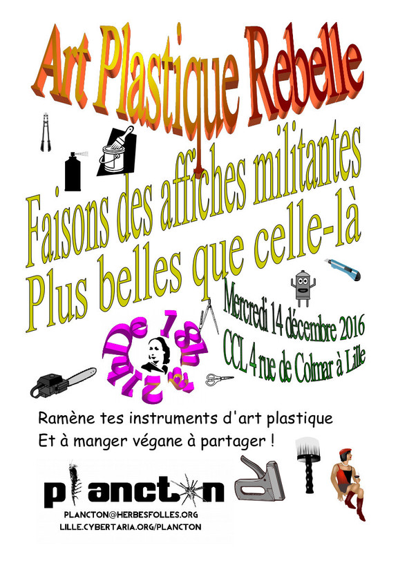 Pour contrer le froid paralysant ambiant, le collectif PL'ANCTON[*] vous invite à libérer votre énergie créatrice et offensive, le 14 décembre 2016 à 18h au Centre Culturel Libertaire[**], en confectionnant des affiches "déter" !