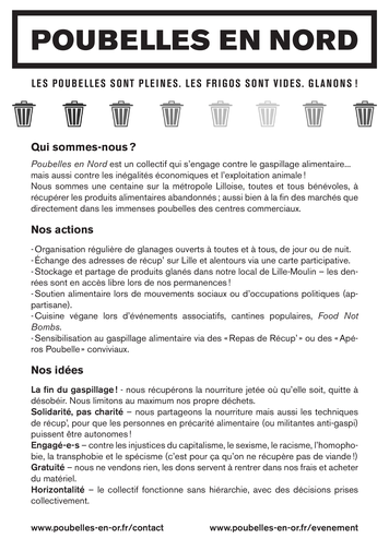 Poubelles en N-or-d est un collectif de glaneuses & glaneurs militant.e.s qui fouillent les poubelles pleines laissées (presque) à l'abandon de la métropole (surtout les hypermarchés). Toutes les trouvailles sont ensuite partagées, et partent soit remplir des frigos un peu trop vides, soit dans des marmites pour y être transformées en plats véganes.