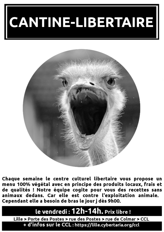 Notre équipe cogite pour vous des recettes sans animaux dedans. Car elle est contre l'exploitation animale. Cependant elle a besoin de bras le jour j dès 9h00.