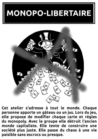 Cet atelier s'adresse à tout le monde. Chaque personne peut apporter un gâteau ou un jus. Lors du jeu, elle propose de modifier chaque carte et régles du monopoly. Avec le groupe elle détruit l'ancien monde capitaliste. Elle tente de construire une socièté plus juste. Elle passe du chaos à une vie paisible sans escrocs ou presque.