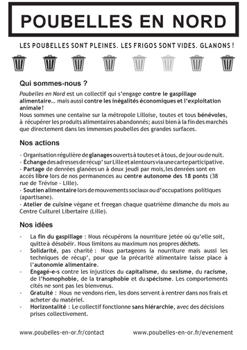 Poubelles en N-or-d est un collectif de glaneuses & glaneurs militant.e.s qui fouillent les poubelles pleines laissées (presque) à l'abandon de la métropole (surtout les hypermarchés). Toutes les trouvailles sont ensuite partagées, et partent soit remplir des frigos un peu trop vides, soit dans des marmites pour y être transformées en plats véganes.