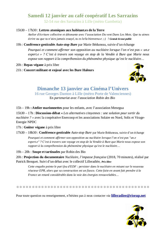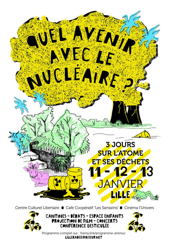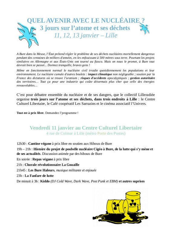 Le collectif Lilleradiée, qui lutte contre le nucléaire et en particulier contre le projet de poubelle radioactive à Bure (Meuse), organise 3 jours sur l'atome et ses déchets, les 11-12-13 janvier à Lille. Pour info toutes les activités sont à prix libre. Voici le programme du vendredi !