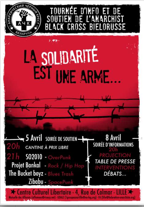 Dans le cadre de l'infotour européen de l'Anarchist Black Cross-Belarus, nous organisons une soirée de soutien et une d'information pour expliquer les moyens utilisés par les activistes en Biélorussie pour lutter contre ce qui est présenté souvent comme «la dernière dictature d'Europe». Plus que jamais, il est vital que l'information circule, pour mettre fin aux règnes des tyrans. Débat et projections