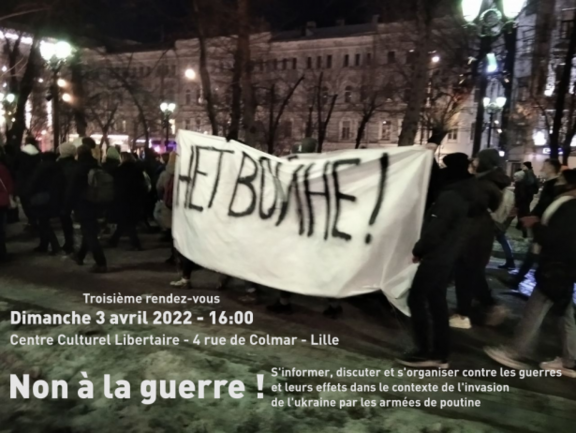 Nous étions une vingtaine dimanche 27 mars 2022 pour discuter antiguerre au Centre Culturel Libertaire. Nous avons mélangé discussions de fond et organisation d'actions d'information et de soutien (rassemblement ou manifestation, cantine, soirée). Voici ce dont nous discutons et ce pourquoi nous voulons nous organiser collectivement : Qu'advient-il du racisme en temps de guerre ? Comment se transforme la forteresse Europe, comment se développent les autoritarismes dans ce contexte ? Qu'advient-il des populations minoritaires et communautés déjà fragilisées (travailleur.se.s précaires, exilé.e.s, LGBTQI+, handicapé.e.s...) lorsque le nationalisme guerrier grandit ? Comment affirmer notre solidarité avec les populations victimes des guerres, entre la russie et l'ukraine mais aussi partout où les guerres et le capitalisme sévissent ? Comment anticiper les famines à venir et les exils qui vont suivre, partout dans le monde ?