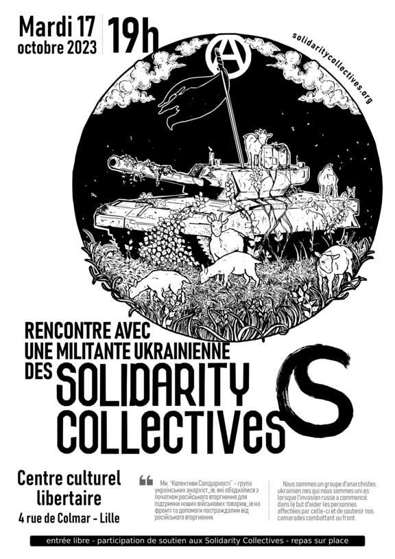 Pour continuer en beauté après la Rentrée anarchiste, une rencontre est organisée le mardi 17 octobre 2023 à 19h au CCL avec une militante ukrainienne des Solidarity Collectives.