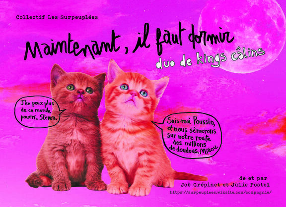 Vous avez les paupières lourdes et les yeux qui piquent ? Vous rêvez de sauter dans votre pyjama en moumoute pour vous enfoncer dans un sommeil long et profond ? Faites-vous aider par notre grand show du dodo ! A grands coups de berceuses, de contes mignons et de performances acrobatiques, Steven et Poussin vous guideront vers des pays où les rois s'embrassent et où les bébés bercent les mamans épuisées. Nos 2 kings câlins sèment sur leur route du gender trouble et des kilos de doudous.